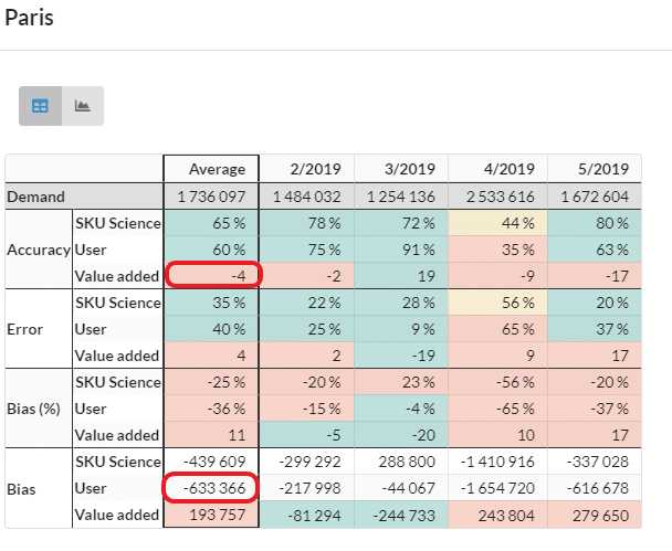 It is easy to see in this table that the teams’ added value related to the forecast accuracy, in red, is 4% lower than the one obtained by the platform. Therefore, it is necessary to take corrective actions during the next cycles, to turn this figure into a positive. We will share some advice in another article to be successful. Without improvement in the next cycles, it is preferable not to change any platform’s forecasts and to avoid wasting your teams’ time.